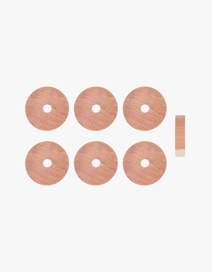 Ringar i cederträ som kan hängas på en galge för att hålla skadedjur borta från dina kläder i garderoben. Ringarna avger en härlig naturlig doft. Slipa ringarna med sandpapper när de slutat dofta för att förnya effekten.