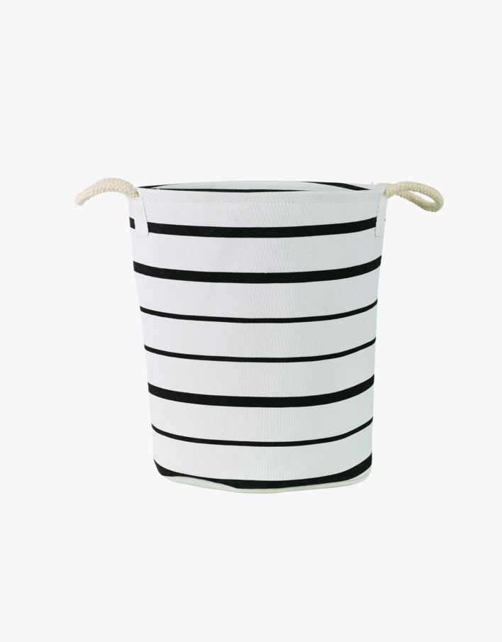 Randig tvättkorg med rephandtag. En vit tvättkorg med klassiska svarta ränder och dekorativa rephandtag. Korgen tillför funktion samtidigt som den blir en dekorativ detalj i badrummet eller i tvättstugan. Korgen har handtag som gör det enkelt att bära med sig korgen till tvättmaskinen. Tvättkorgen är 43 cm hög.