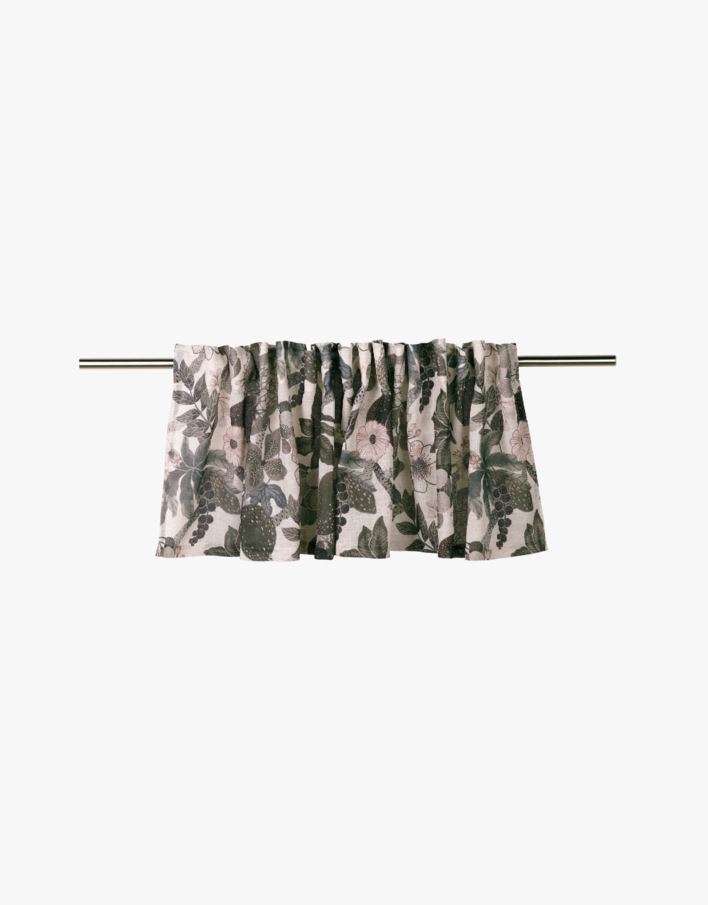 Mönstrad gardinkappa i halvlinne. Gardinen har ett härligt fruktmönster. Gardinen är en multibandslängd vilket innebär att den kan hängas upp på tre olika sätt med fingerkrokar, rynkbandskrokar eller hängas upp direkt på stången med hällor. Förpackningen innehåller 1 gardin.