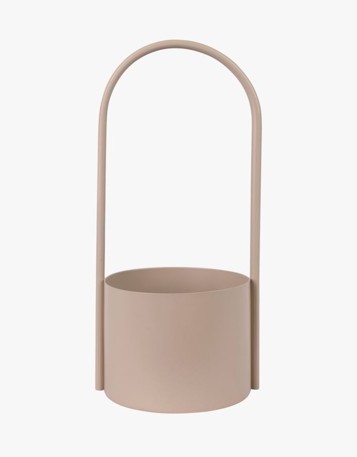 Kruka av metall i ljusbeige ton. Krukan har ett handtag som kan användas för att hänga upp den i hemmet eller för att låga växten klättra längsmed handtaget. En dekorativ kruka med stilren design som passar i de flesta hem och inredningsstilar. Fin att ha stående eller hängande i fönstret med en grön växt.