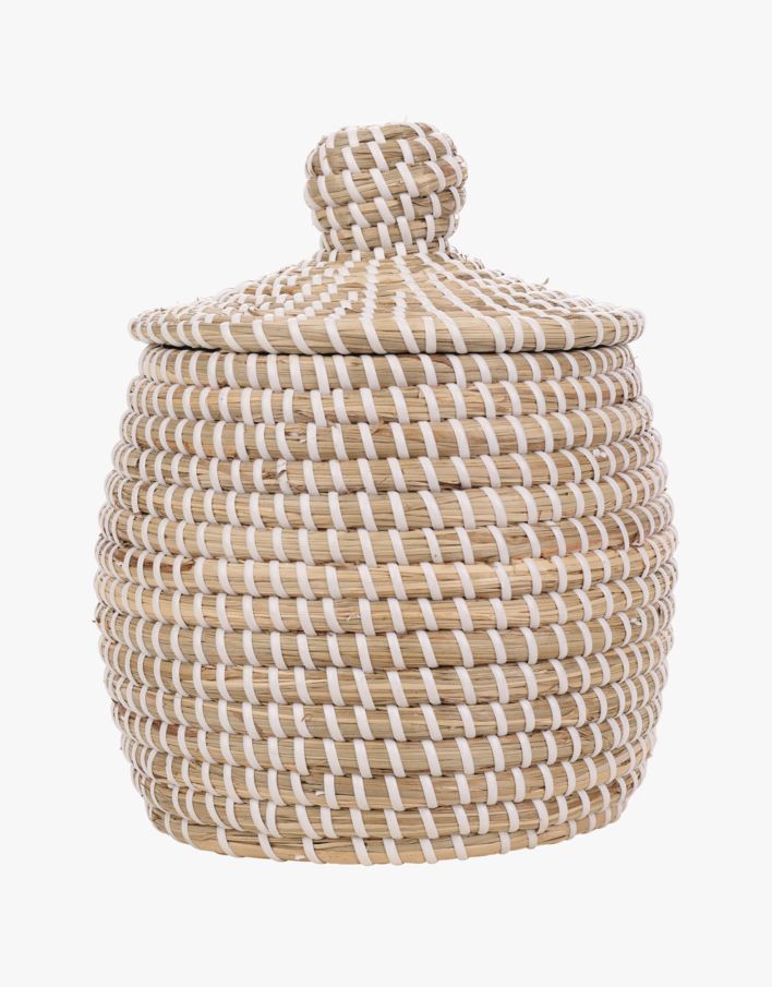 Rund förvaringskorg med lock. Korgen kan användas till förvaring av handdukar i badrummet, små förvaring i vardagsrummet eller till leksaker i barnrummet. En förvaringskorg som är lika dekorativ som funktionell, vilket gör att den passar i flera olika rum. Korgen är naturfärgad med vita detaljer. Finns i två olika storlekar, varav detta är den mindre varianten.