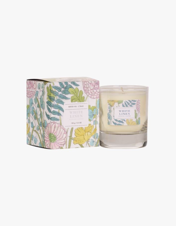 White Linen doftljus har en mild och behaglig doft. Doftljuset är tillverkat av paraffin och certifierat vax, innehåller 150 g och har en brinntid på cirka 20 timmar. Ljuset kommer i en dekorativ förpackning. Läs anvisningarna på förpackningen före användning.