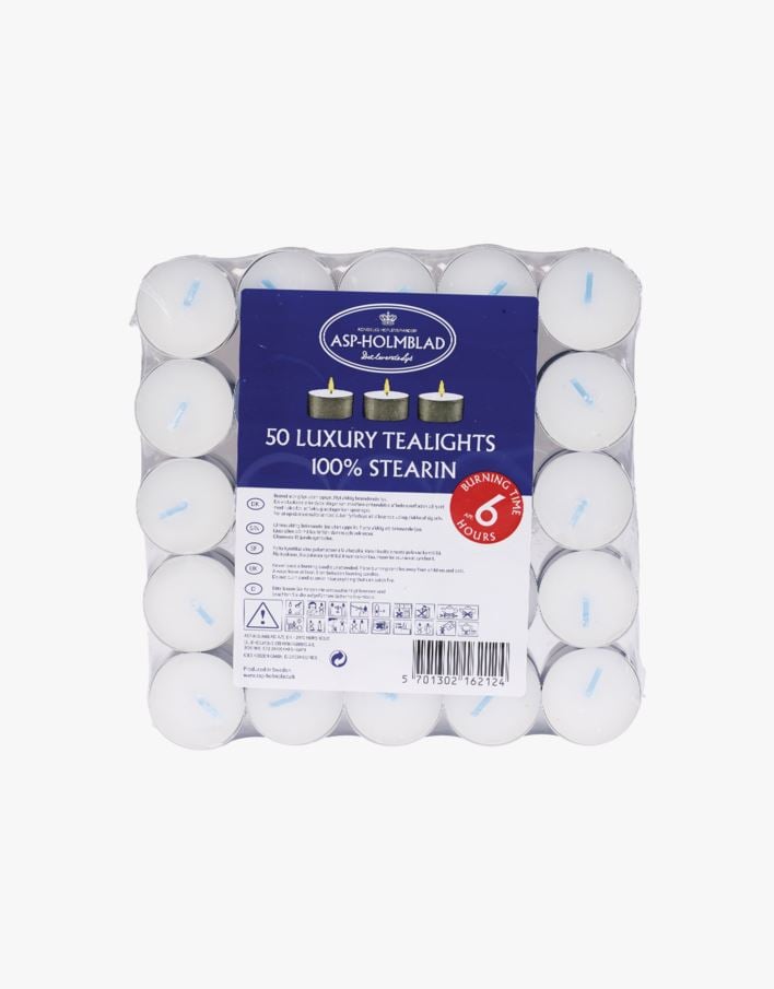 Värmeljus av 100% stearin i en metallkopp. Förpackningen innehåller 50 stycken värmeljus. Varje ljus har en brinntid på cirka 6 timmar.