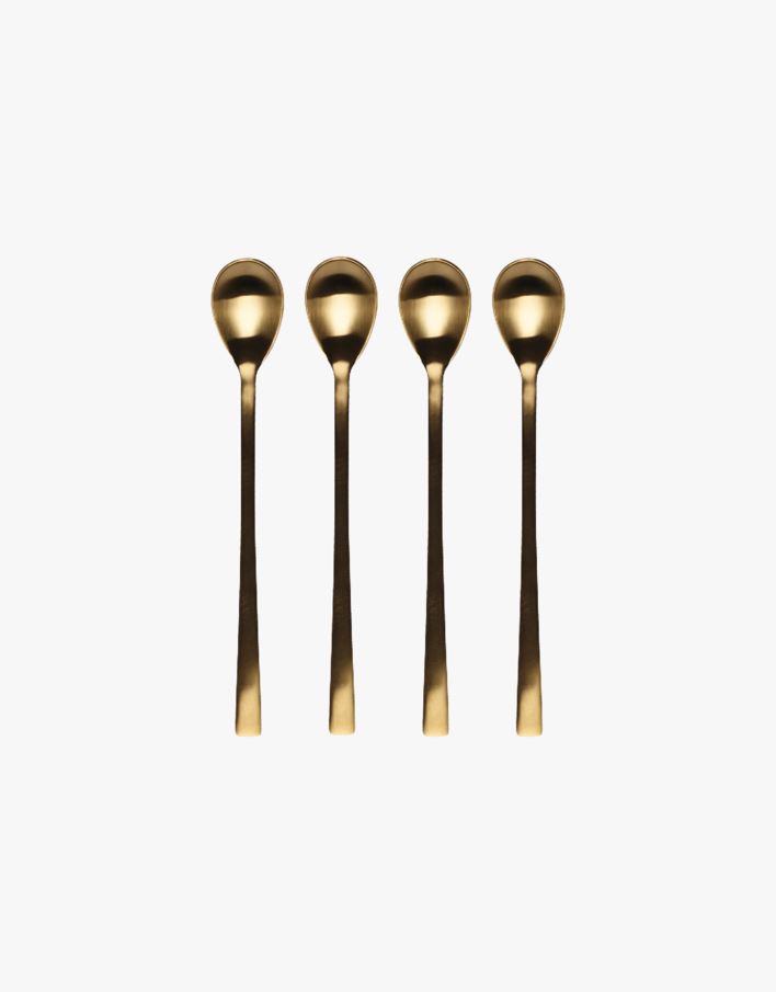 Ett set med fyra guldfärgade latteskedar. Fina att kombinera med våra guldfärgade bestick för ett enhetligt intryck. Tål maskindisk. Tål maskindisk.