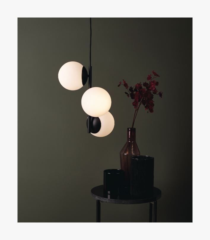 Taklampa från Funkle med tre runda lampskärmar i munblåst glas.