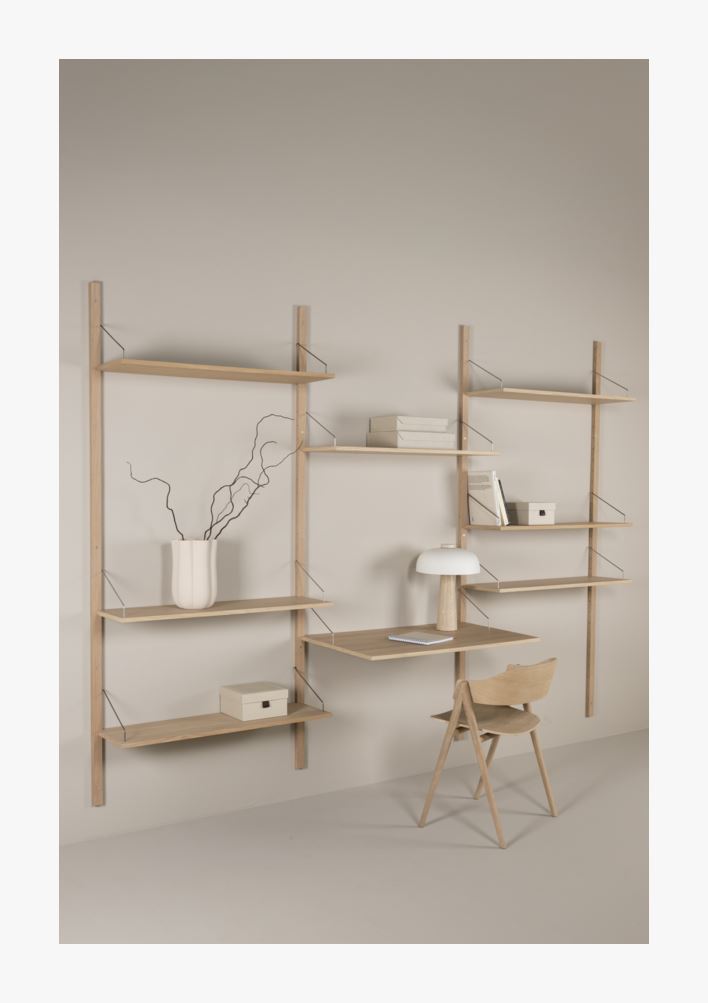 Paketet innehåller 4 långa väggfästen, 7 hyllplan och 1 skrivbordsskiva. Iben är ett funktionellt hyllsystem i en stilren design med praktisk förvaring för hemmets alla rum. Med sitt tidlösa uttryck och flexibla uppsättning passar Iben lika bra i vardagsrummet och köket som på hemmakontoret eller sovrummet. Material med omtanke Iben kombinerar styrka och skönhet med väggfästen i massiv björk, belagd med ekfanér – en varm och naturlig yta som ger ett exklusivt uttryck. Hyllplan och skrivbordsskivor är tillverkade av spånskiva med ekfanér, vilket ger en robust men lätt lösning utan att kompromissa med kvalitet eller utseende. Bygg din egen lösning Med Iben har du full frihet att skräddarsy ditt eget system. Välj bland olika hyllor och skrivbordsskivor och sätt ihop en kombination som passar dina behov och din stil. Vill du ha en enklare lösning? Välj bland våra färdigkomponerade kombinationer – klara att ge nytt liv åt dina väggar. För alla rum – för alla behov Oavsett om du behöver förvaring för böcker, en organiserad arbetsplats eller en dekorativ hylla för dina favoritföremål, anpassar sig Iben efter rummet och rollen. Stabil, flexibel och vacker – det här är ett system som växer med dig och ditt hem.