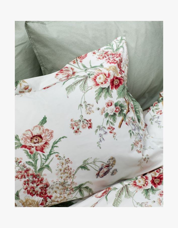 Örngott i lyxig percale med blommönster. Örngottet har en dekorativ vinge som är 5 cm på 3 av sidorna. Ett örngott i percale som är mjukt och behagligt att sova på. Örngottet är tillverkat av 100 % bomull, tätvävd med extra långa och fina bomullsfibrer som gör tyget slitstarkt. Percale är mycket hållbart och välkänt för sin slitstyrka. Maskintvätt 60 grader.
